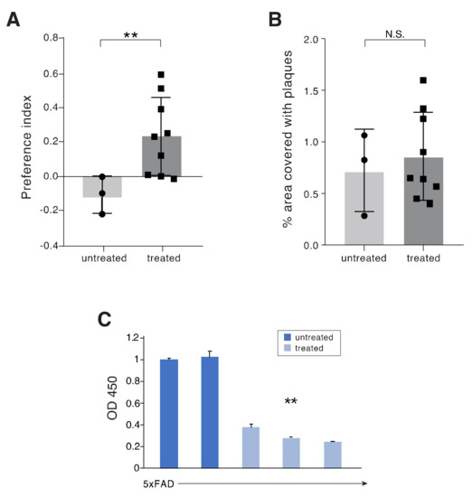 2.4. In Vivo Treatment of 5xFADXTau (FT) Mice or 5xFAD with APP1 and Tau1 Mixture and Its Effect on Cognition, Plaques and Soluble Brain Aß 1–42 Levels