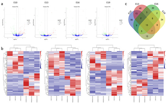 Differentially expressed miRNAs (DEMs) were identified using two criteria, fold change (FC) ≥ 2 and p < 0.05, between broilers and layers at four time points (E10, E13, E16, and E19). A total of 233 DEMs were detected (Table S3 and Figure 2a). Among them, 118 (59 upregulated and 59 downregulated), 94 (42 upregulated and 52 downregulated), 62 (27 upregulated and 35 downregulated), and 90 (33 upregulated and 57 downregulated) were detected at E10, E13, E16, and E19, respectively. Clustering analysis indicated that the miRNA expression patterns were different in broilers and layers (Figure 2b). In addition, 150 of the DEMs were differentially expressed at one of the time points, whereas the other 83 were differentially expressed at multiple time points (Figure 2c).