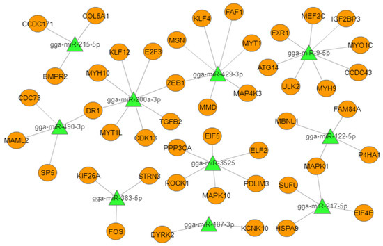 Proposed miRNA–mRNA interaction network of the 10 most abundant differentially expressed miRNAs (DEMs) with their potential target mRNAs. The miRNAs are represented by green triangles and targets are represented by orange circles.