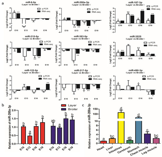 Experimental validation of differentially expressed miRNAs (DEMs) by qRT-PCR. (a) qRT-PCR validation of nine differentially expressed miRNAs in four comparison groups. (b) Expression levels of miR-200a-3p in breast muscle of broilers and layers at four embryonic ages. (c) Expression levels of miR-200a-3p in tissues of broiler chickens, the mRNA level in the heart as control. Data are presented as mean ± SEM (n = 3). *p < 0.05; **p < 0.01.