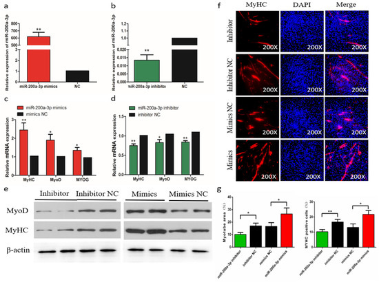 Effects of miR-200a-3p on the differentiation of skeletal muscle satellite cells (SMSCs). (a,b) Expression of miR-200a-3p in SMSCs was monitored using qRT-PCR following transfection with a miR-200a-3p inhibitor or mimic. (c,d) The relative expressions of myogenic determination 1 (MyoD1), myosin heavy chain (MyHC), and myogenin (MyoG) mRNA in SMSCs differentiated for 48 h. (e) Western blot detects protein levels of myogenic marker genes after inhibition and overexpression of miR-200a-3p. (f) Representative images of immunofluorescent staining of differentiated SMSCs (200×). Myosin: Red, a molecular marker of myogenesis; DAPI: Blue, cell nuclei; Merge: The fusion of SMSCs into primary myotubes. (g) Myotube area (%) and MYHC positive cells (%) after transfection of miR-200a-3p mimics, miR-200a-3p inhibitors, or negative control (NC). Data are expressed as mean ± SEM (n = 3). *p < 0.05; **p < 0.01 vs. NC.
