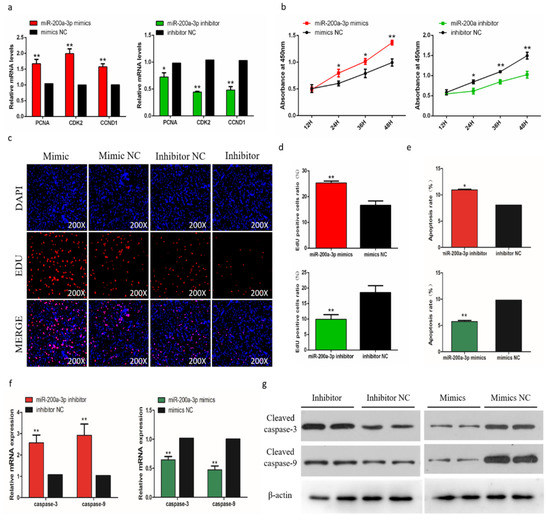Effects of miR-200a-3p on the apoptosis of skeletal muscle satellite cells (SMSCs). (a) Detection of mRNA levels of SMSC cell proliferation-related genes after overexpression and inhibition of miR-200a-3p by qRT-PCR. (b) Cell Counting Kit-8 (CCK-8) detects SMSCs after overexpression and inhibition of miR-200a-3p. (c,d) EdU staining and chicken SMSCs proliferation rate after transfection of miR-200a-3p mimics and inhibitors in SMSCs. The results are shown as an average scanning electron microscope, and the data represent at least three independent analyses. Student’s t-test was used to compare the expression levels between groups. (e) Scattergram and the rate of apoptosis in SMSCs transfected with miR-200a-3p mimics or miR-200a-3p inhibitors as analyzed using flow cytometry following staining with annexin V and PI. (f,g) Abundance of mRNA and proteins of caspase-3 and caspase-9 in SMSCs transfected with miR-200a-3p inhibitors and miR-200a-3p mimics as determined by the use of qPCR and Western blot analysis. Data are expressed as mean ± SEM (n = 3). *p < 0.05; **p < 0.01 vs. NC.