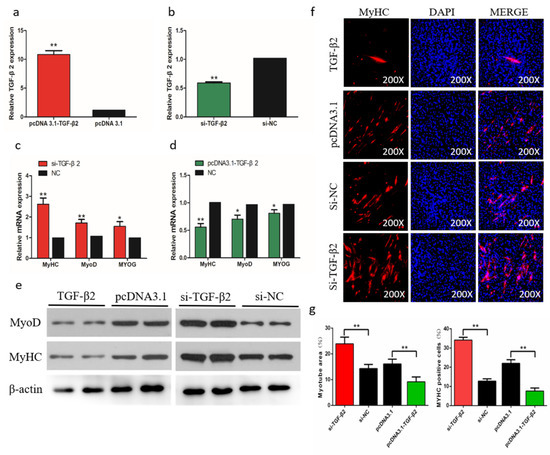 To determine the role of TGF-β2 in differentiation of chicken SMSCs, we constructed effective overexpression vectors and short interfering RNAs (siRNAs) of TGF-β2 to treat the SMSCs (p < 0.01, Figure 8a,b). The expression levels of MyoD1, MyoG, and MyHC increased after TGF-β2 knockdown in SMSCs but decreased in cells with overexpressing TGF-β2 (p < 0.05, Figure 8c,d). The abundance of MyoD1 and MyHC followed a similar trend with the TGF-β2 treatments (Figure 8e). The immunofluorescence results that overexpression of TGF-β2 inhibited myoblast fusion to form myotubes, whereas interference of TGF-β2 promoted this process in SMSCs (Figure 8f,g). Overall, these results indicated that TGF-β2 inhibited the differentiation of SMSCs.