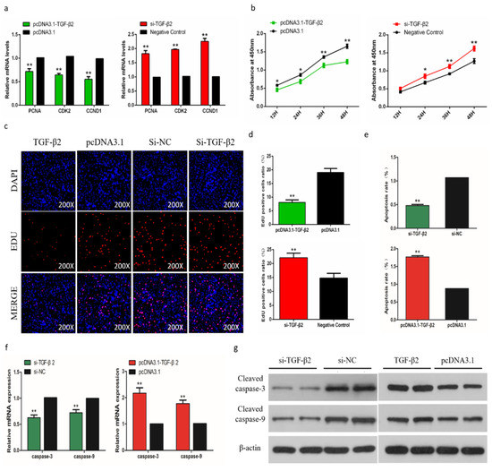 In order to assess the biological effect of TGF-β2 on the proliferation of SMSCs, we detected the expression of marker genes and the trend of CCK-8 during cell proliferation. The results showed that after knockdown of TGF-β2, the proliferation of SMSC was significantly promoted, and overexpression of TGF-β2 induced the opposite result (Figure 9a,b). The EdU analysis also showed similar results (Figure 9c,d). To determine the role of TGF-β2 in the apoptosis of SMSCs, we used a flow cytometry to analyze the apoptosis after regulating the abundance of TGF-β2 in SMSCs. The results showed that the percentage of apoptotic was significantly increased in TGF-β2 overexpressed cells, while knocking down TGF-β2 reduced the level of apoptosis in SMSCs (Figure 9e). We also detected the CASP3 and CASP9 regulators associated with apoptosis in SMSCs. Changes in mRNA expression and protein abundance of these regulators also indicated that TGF-β2 promoted the apoptosis of SMSCs (Figure 9f,g).