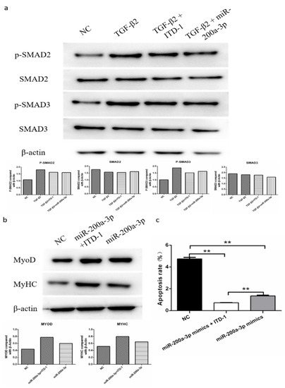 MiR-200a-3p regulates differentiation and apoptosis of skeletal muscle satellite cells (SMSCs) via the TGF-β/SMAD pathway. (a) After overexpression of TGF-β2/TGF-β2 + miR-200a-3p/TGF-β2 + ITD-1, the protein levels of TGF-β/SMAD pathway genes were detected using Western blotting. (b,c) Effect of miR-200a-3p mimics on differentiation and apoptosis of SMSC cells in the absence or presence of ITD-1. Data are expressed as mean ± SEM (n = 3). *p < 0.05; **p < 0.01 vs. NC.