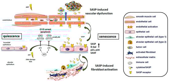 Cellular stress, and in particular DNA-damaging drugs and ionizing radiation, can induce senescence in most lung cell types. Persistence of senescent cells in turn remains a major problem in certain lung diseases as these senescent cells or more precisely their altered secretory profile, the so-called SASP, might foster lung injury. However, the precise role of each senescent cell type within lung (radiation) injury remains elusive because it depends on the pathological trigger (e.g., dose and fractionation for RT) and the temporality of the observation [22]. The following sections address the recent findings concerning cellular senescence in lung fibroblasts, endothelial and epithelial cells and with respect to their potential contribution to lung injury and particularly pulmonary fibrosis, with a special focus on radiation-induced lung injury.