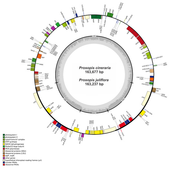 Genome map of the P. juliflora and P. cineraria cp genomes. The extent of the inverted repeat regions (IRs) is represented by thick lines, which divide the cp genome into large (LSC) and small (SSC) single copy regions. Genes drawn inside the circle are transcribed clockwise, while those outside of the circle are transcribed counter clockwise. Genes belonging to different functional groups are color coded. The dark grey in the inner circle corresponds to the GC content, while the light grey corresponds to the AT content.