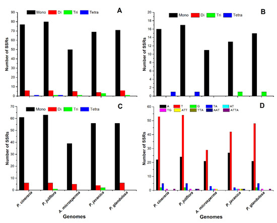 In P. juliflora and P. cineraria most of the SSRs were detected in intergenic spacer (IGS) regions (79.5% and 79.7%) respectively, followed by coding sequences (CDSs) (20.4% and 10.2%) (Figure 2B,C). Mononucleotide A/T repeat units contained the highest proportion up to 90% in P. juliflora, 91.6% in P. cineraria, 91% in P. glandulosa, 90.7% in P. javanica, and 89.2% in A. microsperma (Figure 2D). Mononucleotide G repeats detected only in P. juliflora, P. cineraria and P. glandulosa. Among dinucleotides repeat, TA was found more frequently than AT. The tetranucleotide repeats were ATTA, which appeared only in P. juliflroa and P. cineraria, respectively (Figure 2D).