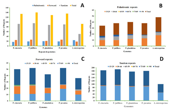 Repetitive sequences play significant roles in rearrangement and stabilization and cp genome sequences [48] and can affect copy number difference among similar and different species. Length variation and variable copy numbers have encouraged the extensive use of cp SSRs in biogeographic studies and plant population genetics, particularly at lower taxonomic levels [49,50]. These characteristics in cp genomes can be used for molecular marker designing and play vital role in plant identification [51] and phylogenetic analyses [52]. A total of 140, 134, and 129 repeats were found in the P. juliflora, P. cineraria, and P. glandulosa cp genomes, respectively. Cp genome repeat sequences contribute significantly to genomic structural variations, rearrangements or expansions [41,53]. Similarly, about 135 and 92 total repeats were detected in the P. javanica and A. microsperma cp genomes, respectively (Figure 2). P. juliflora comprises the lowest number of forward repeats (19) while the lowest palindromic repeats were found in P. cineraria cp genome (Figure 3). In our study, tandem repeats were determined to be the most plentiful in the P. juliflora (95) cp genome, showing similar traits to the previously reported cp genome [42,44]. It is obvious from earlier reports that high number and complex repeats also play key roles in cp genomes rearrangement and evolutions [53,54,55].