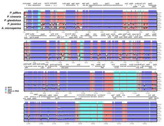 Visual alignment of plastid genomes from P. juliflora with P. cineraria, P. glandulosa, P. javanica and A. micosperma cp genomes. VISTA-based identity plot showing sequence identities among five species, using P. juliflora as a reference. Genome regions are color-coded as protein coding, rRNA coding, tRNA coding, or conserved noncoding sequences (CNS). The x-axis represents the coordinate in the chloroplast genome. Annotated genes are displayed along the top. The sequences similarity of the aligned regions is shown as horizontal bars indicating the average percent identity between 50% and 100%.