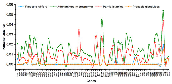 Pairwise distance of 75 genes from P. cineraria (as reference genome) with P. juliflora, P. glandulosa, P. javanica and A. microsperma cp genomes.