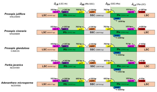 In spite of the collinear gene order found in most land plant, some notable changes such as gene loss [68], sequence inversion [69], and contraction and expansion at the borders between IRs, SSC, and LSC regions [70]. Similarly, length variation among cp genomes were observed due to the contraction and expansion of the IR regions [71,72]. However, IR regions have been lost in some cp genomes, such as Erodium, Carnegiea [73], and some Fabaceae members [74]. The Prosopis cp genomes were highly conservative in size, structure, SC and IR boundary locations among species were slightly diverse due to contraction or expansion of the cp genome, as reported in most land plants [75,76,77]. In the current study a comprehensive assessment of the four junctions (JLA, JLB, JSA, and JSB) between the two single copy regions (LSC and SSC) and the two IR regions (IRa and IRb) of the P. cineraria, P. juliflora, P. glandulosa, P. javanica, and A. microsperma cp genomes was performed. Regardless of the parallel lengths of the IR regions of P. cineraria, P. juliflora, and P. glandulosa, some extension and contraction were detected, with the IR regions ranging from 25,931 bp in Prosopis species to 26,028 bp in A. microsperma. All the four junctions (JLA, JLB, JSA, and JSB) were conserved in three Prosopis cp genomes. However, some variations were observed with P. javanica and A. microsperma cp genomes (Figure 6). The partially duplicated genes found at the beginnings and ends of the IR regions, including 103 bp of rps19 in P. juliflora and P. cineraria and 101 bp of rps19 in P. glandulosa from JLB. The boundaries between IRs, SSC, and LSC were similar in all the cp genomes studied. The IRb/LSC boundary of the studied cp genomes from subfamily Caesalpinioideae is detected in the rps19 gene, and a small portion of the rps19 gene is also found in the IRb region, as reported in previously angiosperm cp genome such as in O. vulgare [78], S. miltiorrhiza, and some species from Ilex genus [79]. On the other hand, some cp genomes such as in Lupinus luteus [80] and Millettia pinnata [81] the rps19 gene does not extend into the IR region. Similar results were mostly reported in numerous monocots cp genome such as, in the Oryza AA genome [82], the rps19 gene present inside the IR region [83].