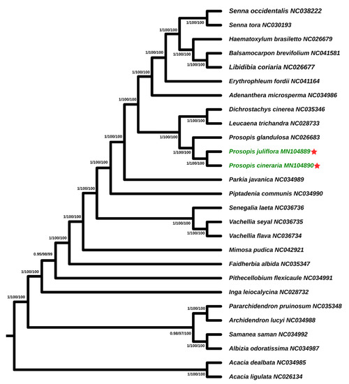Phylogenetic tree of P. juliflora and P. cineraria within the subfamily Caesalpinioideae (Leguminosae). The entire genome data set was analysed using three different methods: Bayesian inference (BI), maximum parsimony (MP) and maximum likelihood (ML). Numbers above and below the branches represent bootstrap values in the MP and ML trees and posterior probabilities in the BI trees. The green color and red stars represent the positions of P. juliflora and P. cineraria.