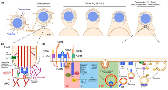 This sequence of events occurs at different timescales. The type of stimuli and sensor receiving and transducing the signal (mechanical or chemical) [20,21], the threshold and duration of triggering events [22], and the amplitude and amplification of the downstream signaling cascade [23,24] will determine the timescale of the signaling events. Thus, early T cell activation leading to IS formation occurs in three overlapping stages that progress at different time rates (Figure 1a) [19,25]. Firstly, the initial T cell-APC interaction requires an extremely fast rearrangement of the cell membrane and cytoskeleton that will evolve to a more stable interphase. During this stage, recognition of TCR and pMHC is essential, but mechanical cues also play an important role in the fast dynamics that occur in this phase. In a second stage, the area of contact between cells is maximized by changes in cell shape and an active relocation of molecules takes place within the interface, as well as new recruitment from other areas of the cell to the area of contact. During this phase, signal transduction mostly relies on amplification of signaling cascades and constant trafficking of signaling molecules to the interface and to recycling compartments. Finally, a third phase involves maturation and stabilization of the T cell-APC interaction, leading to formation of the IS. During this last phase, that lasts longer than the previous stages (Figure 1a), T cells distribute signaling events into domains, relying on several strategies of spatial regulation of signals. This confers structural stability while maintaining a sustained signaling.