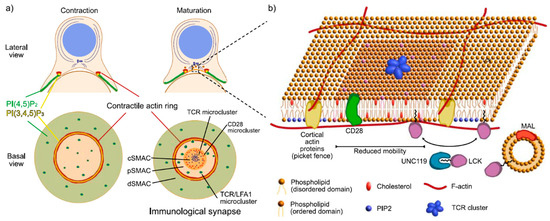 The IS is a clear example of spatial regulation. The structure of the IS varies depending on the type of T cells and APCs involved (primary, cooperative, or cytotoxic T cells), their stage of maturation, and the outcome of their interaction [2,3,89]. For instance, CD3ζ localization pattern differs between thymocytes and mature T cells [90]. The most commonly studied IS is that of CD4+ T cells interacting with lymphoma B cells or cytotoxic T cells, that mature into a bull’s eye-like structure formed by three concentrical rings termed supramacromolecular activation centers (SMACs): The cSMAC at the center; the pSMAC, a peripheral ring that surrounds the cSMAC; and the dSMAC, at the edge/distal area of the synapse [8] (Figure 2a). The dSMAC develops from an actin ring [9,91] (Figure 2a) that will first expand and later retract in a process dependent on nonmuscular myosin IIA [92,93].