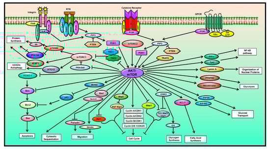 Many different cellular processes such as protein synthesis, autophagy, cell cycle regulation, glycogen metabolism, fatty acid synthesis, nutrient uptake, organization of nuclear proteins, regulation of different hallmarks of cancer like proliferation, survival, angiogenesis, invasion, migration and apoptosis of the cancer cells and the modulation of other signaling pathways such as the nuclear factor kappa-B (NF-κB), extracellular-signal-regulated kinase (ERK), Janus kinase (JAK)-signal transducer and activator of transcription (STAT), are all influenced by the AKT/mTOR signaling pathway [1,13,14,15,16,17] (Figure 1). The key proteins involved in the regulation of this pathway are phosphoinositide 3-kinase (PI3K), AKT and the mTOR proteins. When different growth factors and ligands such as integrins, receptor tyrosine kinases (RTKs), cytokine receptors and G protein-coupled receptors (GPCRs) bind to their respective receptors on the cell membrane, they generate a stimulus and cause the activation of the cell surface receptors, subsequently leading to the phosphorylation of PI3K [18,19,20,21,22,23].