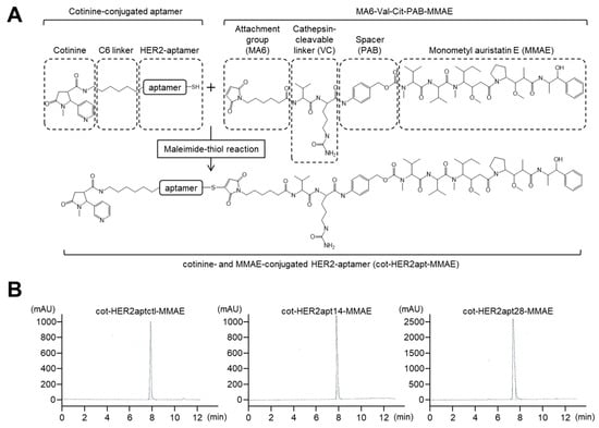 Synthesis of cot-HER2apt-MMAEs and their purification. (A) The cot-HER2apt-MMAEs consist of three main components: the cotinine-linker, HER2 aptamer, and MMAE-linker. The cotinine-conjugated HER2 aptamers (cot-HER2apts) were conjugated at the 3′-end with maleimidocaproyl-valine-citrulline-p-aminobenzoyloxycarbonyl-monomethyl auristatin E (MA6-VC-PAB-MMAE) through maleimide-thiol reactions. (B) Cot-HER2aptctl-MMAE, cot-HER2apt14-MMAE, and cot-HER2apt28-MMAE were purified to >98% purity by reverse-phase high-pressure liquid chromatography (C18 column).