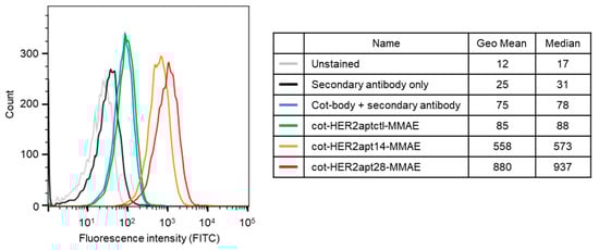 Flow cytometric analysis of cot-HER2apt-MMAEs. NCI-N87 cells (3 × 105) were incubated with 100 pmoL of cot-HER2aptctl-MMAE, cot-HER2apt14-MMAE, or cot-HER2apt28-MMAE at 4 °C. The cells incubated with 100 pmoL of fluorescein isothiocyanate (FITC)-labeled secondary antibody (with or without primary antibody) served as negative controls. Fluorescence was measured by using a FACSVerse flow cytometer.