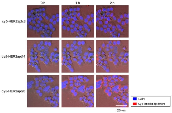 Confocal microscopic imaging of cy5-HER2apts internalization. NCI-N87 cells (3 × 105) were treated with Cy5-labeled aptamers (cy5-HER2aptctl, cy5-HER2apt14, and cy5-HER2apt28) and DAPI, and incubated at 37 °C for 2 h. The representative are merged images of DIC, DAPI, and Cy5. Internalization of aptamers was visualized using an LSM 780 confocal microscope. Representative fluorescent images were obtained at 0, 1, and 2 h post treatment with cy5-HER2apts. Original magnification, 40×; Scale bar, 20 μm.