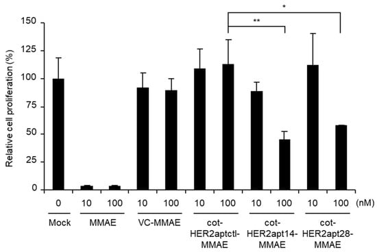 Cytotoxic effect of cot-HER2apt-MMAEs on NCI-N87 cells. The cells (1 × 104) were treated for 6 d with 10 or 100 nM free monomethyl auristatin E (MMAE), valine-citrulline (VC)-MMAE, cot-HER2aptctl-MMAE, cot-HER2apt14-MMAE, or cot-HER2apt28-MMAE. Cell viability was assessed using WST-1 proliferation assays. Data are shown as the mean ± standard deviation (SD). The p-value was calculated using Student t-test (* p < 0.05 and ** p < 0.01).