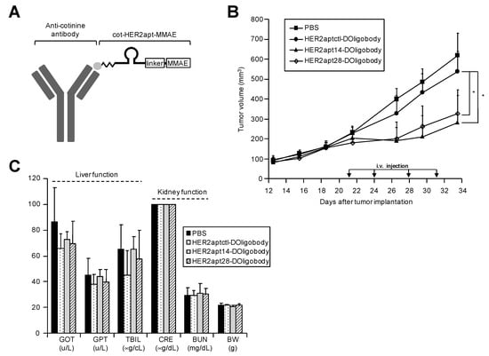 In the current study, we developed a novel platform referred to as a “Drug-conjugate Oligobody” (DOligobody), which had monomethyl auristatin E (MMAE) conjugated at the 3′-end of the aptamer to enhance the potency of the oligobody. MMAE is an antimitotic agent that inhibits cell division by blocking tubulin polymerization [,]. For this proof-of-principle study, we used cotinine-conjugated anti-HER2 DNA aptamer sequences previously developed by Mahlknecht G. et al. []. The 14-mer aptamer and dimeric 28-mer aptamer, conjugated with cotinine, were designated as cot-HER2apt14 and cot-HER2apt28, respectively. We found that the cot-HER2apts showed specific binding and receptor-mediated endocytosis in HER2-positive cancer cells, and cot-HER2apt-MMAEs effectively inhibited cell viability. Moreover, a cot-HER2apt-MMAE oligobody (HER2-DOligobody) significantly reduced tumor growth in a xenograft mouse model, without causing severe toxicity. These results suggest that our DOligobody strategy may be applicable as an attractive anti-cancer therapeutic platform.