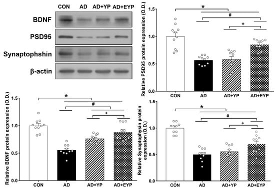 2.7. Effect of Plasma from Young Exercised Mice on the Expression of BDNF, PSD 95, and Synaptophysin in the Hippocampus