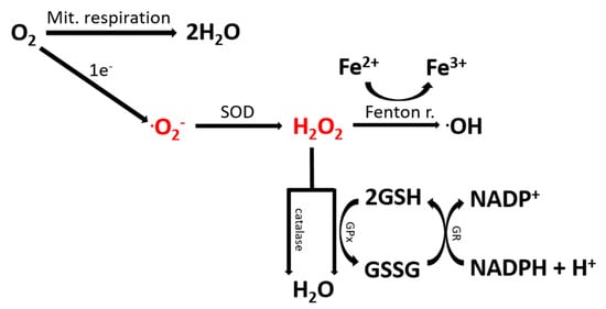 Reactions required for the detoxification from reactive oxygen species (ROS). Enzymes catalyzing the major detoxification reactions are reported. Abbreviations: Fenton r.: Fenton reaction; GPx: glutathione peroxidase; GR: glutathione reductase; Mit.: mitochondrial; SOD: superoxide dismutase.