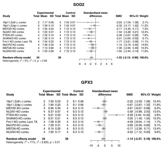 When we analyzed the expression of molecules involved in the ROS scavenging system in ASD mouse models present in the dbMDEGA database, similar results could be observed. In particular, the levels of SOD2 and GPX3, two of the genes differentially expressed in ASD patients, were also reduced in at least some of the ASD models (Figure 2).