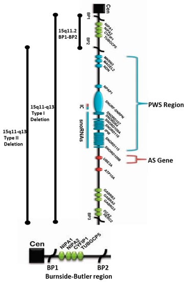 These imprinting disorders typically are caused by a deletion in the majority of cases involving the 15q11-q13 chromosome region of different parental origin [i.e., paternal in Prader–Willi syndrome (PWS) and maternal in Angelman syndrome (AS)] [,]. The typical 15q11-q13 deletion involves proximal chromosome 15 breakpoints BP1 or BP2 and the more distally placed BP3 containing repetitive DNA segments allowing malalignment in meiosis of the homologous chromosome 15s leading to deletions or duplications in the region. The individuals with the larger typical type I deletion (involving BP1 and BP3) are found in both Prader–Willi and Angelman syndromes. They are reported with more severe developmental symptoms and clinical severity than individuals with the smaller typical type II deletion (involving BP2 and BP3) []. The 15q11.2 BP1-BP2 microdeletion encompasses a 500kb region located between breakpoints BP1 and BP2 proximal to the centromere of chromosome 15 including the four protein-coding genes (i.e., NIPA1, NIPA2, CYFIP1, TUBGCP5) that become the major focus of this review.