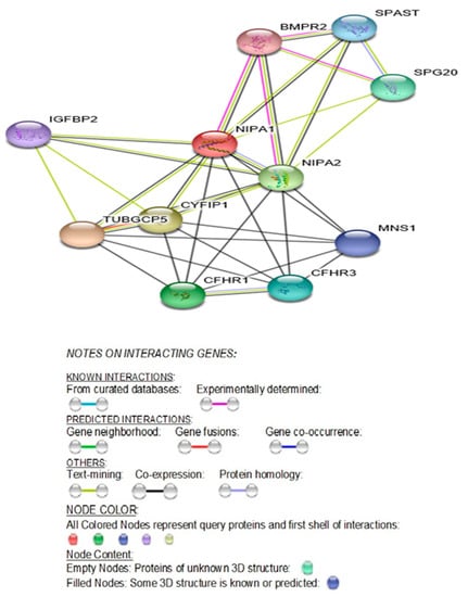 It should be noted, as illustrated in STRING Figure 2 and Table 1, NIPA1, NIPA2, CYFIP1, and TUBGCP5 proteins show protein–protein interactions among themselves with the 11 nodes and 34 edges addressed earlier. As shown in Table 1, NIPA1 protein interacts with TUBGCP5, CYFIP1, and NIPA2 proteins (scores: 0.995, 0.967, and 0.941, respectively) along with seven other protein interactants, and thus predicted to cause significant biological processes (Table 2), and a significant molecular function is magnesium ion transmembrane transporter activity with a 0.0042 false discovery rate (Table 2).