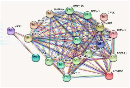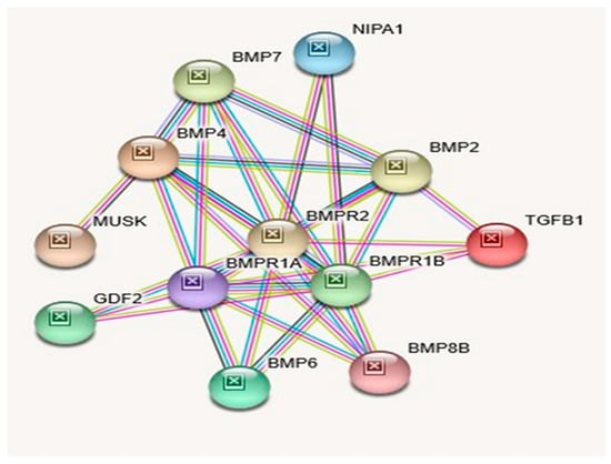 Further highlighting the importance of BMP regulation in neural development is the role of BMP7 in corticogenesis; BMP7 deletions result in reduced cortical thickening and impaired neurogenesis []. Interestingly, BMPR type 1A (BMPR1A) is important in the establishment of neurons involved in regulating feeding behavior []. Similarly, NIPA1 was shown to inhibit BMP signaling by regulating the endosomal trafficking and degradation of type 2 BMP receptors (BMPR2) in Drosophila and HeLa cells [,]. Perhaps, haploinsufficiency of NIPA1 protein in cases of 15q11-q13 BP1 or BP2/BP3 deletions might partially affect its inhibition of BMP signaling by regulating endosomal trafficking and degradation of type 2 BMP receptors, thereby affecting neurons. This might be the causal factor for the reported developmental and language delay, neurobehavioral disturbances, and psychiatric problems, such as autism, seizures, and schizophrenia with occasional mild dysmorphic features seen to a varying degree in patients with the 15q11.2 BP1-BP2 deletion (Burnside–Butler) syndrome [,]. Biological processes (GO), molecular functions (GO), cellular components with KEGG, and Reactome pathways are summarized in Table 3. In Table 4 examples of diseases or disorders which have been recognized and associated with the NIPA1 gene when disturbed are collated and ranked by order using MalaCards (MalaCards.org) from GeneCards (GeneCards.org). STRING functional interactions with nodes and edges (see Figure 3). Further illustrations of interactions and functions of NIPA1 with relationship to other proteins can be found in Table Table 5.