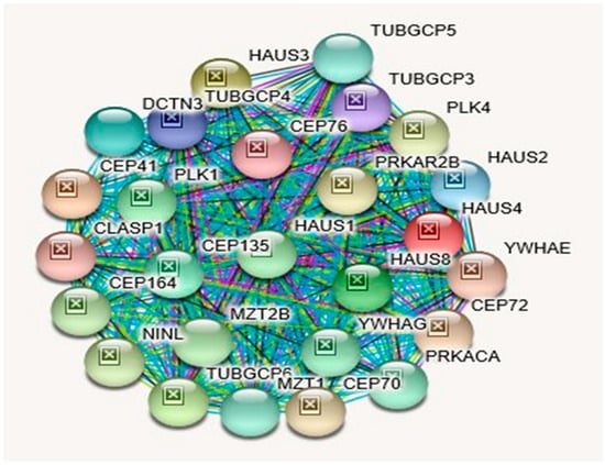 Table 12 shows biological processes, molecular functions, cellular components with KEGG and Reactome pathways related to TUBGCP5. Among its related pathways are Nanog in Mammalian ESC Pluripotency and G-Beta Gamma Signaling. Gene Ontology (GO) annotations related to this gene include microtubule binding, and components of the cytoskeleton (Table 12). Table 13 shows diseases associated with TUBGCP5 gene disturbances based on MalaCards and arranged in descending order including Prader–Willi syndrome as the top disorder followed by schizophrenia and then autism. Table 13 shows proteins and their functions that interact with TUBGCP5, as depicted in Figure 6, illustrating the interactions of the TUBGCP5 gene with other related genes.