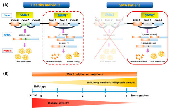 Figure 1 illustrates the genetic pathomechanism of SMA. All patients with SMA have an insufficient amount of a survival motor neuron (SMN) protein, which is encoded by two highly homogenous genes, survival of motor neuron 1 (SMN1) and its copy gene, SMN2. SMN2 is differentiated from SMN1 by one single nucleotide variant (C→T) in exon 7. This critical difference results in the preferential exclusion of exon 7 from most (~90%) SMN2 transcripts, termed SMN△7, which translates into truncated and unstable SMN protein. As a consequence, SMN2 can only generate ~10% of full-length (FL) SMN mRNAs and their product-functional SMN proteins (Figure 1A). While these FL-SMN2 transcripts can partially compensate for the loss of SMN1, it is reasoned that retained SMN2 copy numbers of patients determine the phenotypic severity (Figure 1B). However, such a phenotype–genotype correlation is not absolute, as recent studies have indicated that additional cellular mechanisms (e.g., positive or negative disease modifiers) might also involve the modulation of SMA clinical severity. For example, rare SMN2 variants (c.859G > C), as well as independent modifiers such as plastin 3 or neurocalcin delta, can further influence the disease severity [,,]. In brief, the loss of the SMN1 gene leads to SMA, whose severity is partially modified by various copies of SMN2.