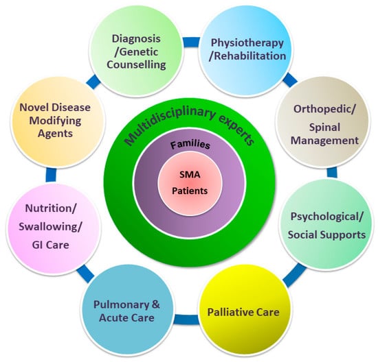 Advances in drug development are likely to impact the natural history of and care methods for patients with SMA [,]. An immediate benefit of multidisciplinary care and care coordination for SMA patients has been the development and distribution of standard-of-care (SOC) recommendations. In 2007, a consensus statement for the standard of care in SMA was released by a multidisciplinary team regarding the current best advice for the management of patients with SMA []. With the advent of disease-modifying treatment that became available in early 2017, a new two-part SOC consensus paper was published in 2018 [,]. The multidisciplinary team should and may include a variety of medical specialties that ideally follow up both the as-yet untreated patients as part of providing a SOC and patients that undergo specific therapies (Figure 2). As patients following SOC guidelines can receive same-level care to reduce the variability of disease progression, it is particularly crucial for those currently participating in clinical trials. Experts recommend that SMA patients on trial should be paired with adherence to SOC provided a core facility of a multidisciplinary care team [,]. As such, revolving SOC guidelines for SMA have assumed a more substantial role of defining what is meant by optimal or even required care.