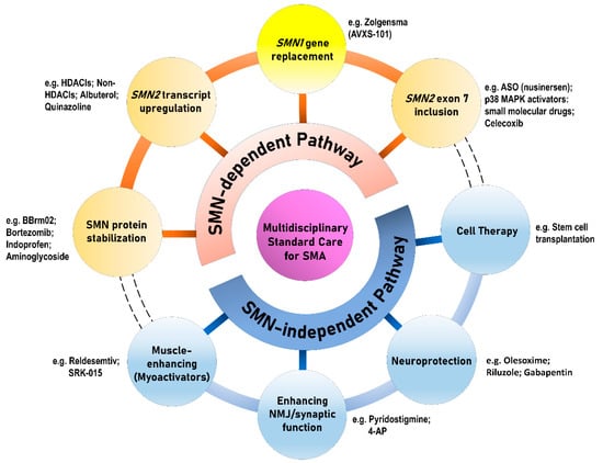 As the first SMN-dependent therapies are emerging into the clinical arena, other approaches beyond SMN augmentation are also under active investigation. However, SMN-dependent approaches pose a particular challenge for patients with chronic forms (types 3 and 4) of SMA, who are often diagnosed beyond the critical therapeutic window []. For the patients with the chronic form of SMA with a substantial loss of MNs, it is more crucial to target the SMN-independent pathways disrupted downstream of SMN. Furthermore, emerging evidence has substantiated that SMA is a systemic disorder that goes beyond motor neurons. Identifying non-SMN targets to develop combinatorial therapeutic approaches is tempting because a comprehensive whole-lifespan approach to SMA therapy is required that includes both SMN-dependent and SMN-independent strategies that treat the CNS and periphery together [,].