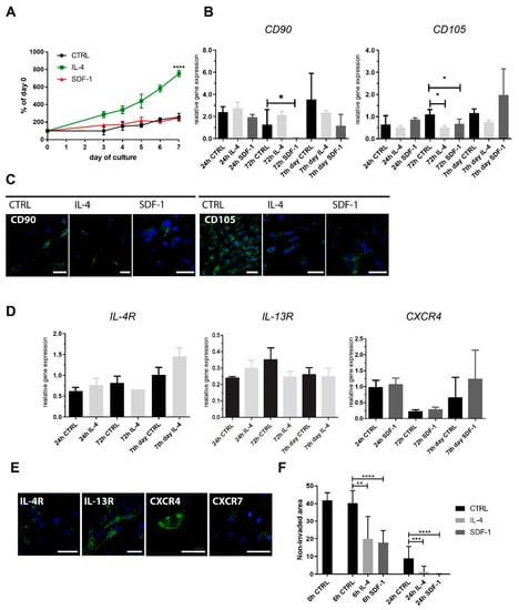 Characterization of rat adipose tissue-derived stromal cells (rADSCs) cultured under control conditions or in the presence of IL-4 or SDF-1. (A) Growth curves of rADSCs cultured for 7 days; (B) analysis of the level of mRNAs encoding CD90 and CD105. Expression was related to the levels observed in control cells at day 0 (beginning of the culture) and normalized to mRNA encoding HPRT; (C) localization of CD90 and CD105 (green) and nuclei (blue) in rADSCs. Bar: 50 µm. (D) Analysis of the level of mRNAs encoding IL-4R, IL-13R, and CXCR4. Expression was related to the levels observed in control cells at day 0 (beginning of the culture) and normalized to mRNA encoding HPRT; (E) localization of IL-4R, IL-13R, CXCR7, and CXCR4 (green) and nuclei (blue) in control cells. Bar: 50 µm. (F) In vitro migration assay—rADSCs were scratched from a culture dish and the area that was not invaded by migrating cells was assessed (6 h and 24 h). N varied between 3 and 9. Data analyzed with Student’s t-test: 1A and D (IL13-R), data analyzed with Mann–Whitney U test: 1B, 1D (IL-4R, CXCR4), 1F. Data are presented as mean ± SD. * represents results: * p ≤ 0.05; ** p ≤ 0.01, *** p ≤ 0.001, **** p ≤ 0.001. CTRL—non-treated cells.