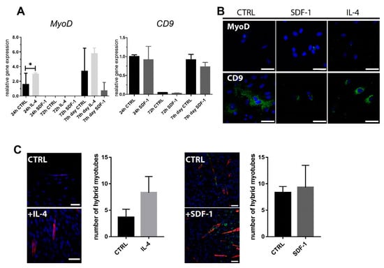 We assessed how IL-4 or SDF-1 impact the ability of rADSCs to initiate myogenic differentiation in vitro. We evaluated the expression of mRNA encoding mesoderm markers: Brachyury and mesogenin, MRFs Myf5 and MyoD, and adhesion proteins M-cadherin and CD9, but were only able to detect MyoD, CD9, (Figure 2A) and Cdh15 (data not shown) mRNAs. Importantly, after 24 h of culture, the level of MyoD expression increased significantly in IL-4 treated cells, but it was not sustained in longer culture, nor was it confirmed by immunolocalization (Figure 2A,B). CD9 mRNA level did not significantly change after SDF-1 treatment (Figure 2A,B). We also did not notice any effect of applied treatment on the ability of BacMam GFP-labeled rADSCs to form hybrid myotubes with mouse C2C12 myoblasts (Figure 2C). Thus, to summarize, in vitro analyses revealed that IL-4 significantly increased the rADSC proliferation rate and that IL-4 and SDF-1 had a significant impact on the cell migration.