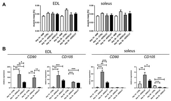 Analysis of muscle mass and stem cell factor expression of rat EDL and soleus skeletal muscles which received control rADSCs or those ones pre-treated with IL-4 and SDF-1. (A) Weight of rat skeletal muscles (shown as percent of body mass): non-injured (NIM), injured and injected with NaCl (CTRL), injured and transplanted with control rADSC (ADSCsC) or IL-4 and SDF-1-treated rADSCs (ADSCsT), analyzed at 14 and 30 day of regeneration; (B) Expression of mRNAs encoding CD90 and CD105 at 14 and 30 day of regeneration. Expression was related to the levels observed in NIM and normalized to mRNA encoding HPRT. For each experimental group n = 3. Data analyzed with of Student’s t-test: 3B, data analyzed with Mann–Whitney U test: 3A. Data are presented as mean ± SD. * represents: * p ≤ 0.05; ** p ≤ 0.01, *** p ≤ 0.001.