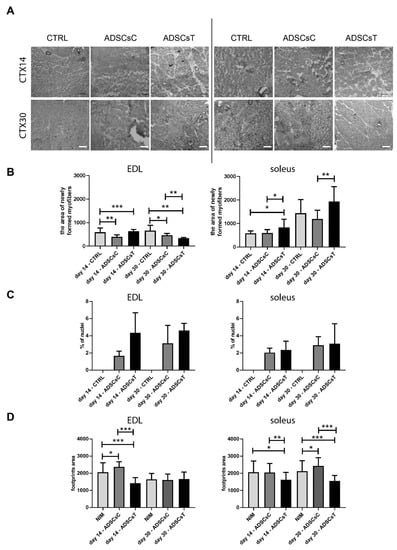 The presence of rADSCs resulted in the increased area of newly formed myofibers, i.e., the ones with centrally positioned nuclei (Figure 4C), which were calculated from the analysis of histological sections (Figure 4A). Such an increase was significant in EDL muscles, which received rADSCs pretreated with IL-4 and SDF-1 at day 14 of regeneration (591.9 ± 179.9 and 634.7 ± 71.15, control and ADSCsT, respectively). In the case of poorly regenerating soleus muscles, this effect was noticeable at day 14 and also day 30 of regeneration (day 14—583.2 97.23 and 836.9 ±, 341.5, day 30—1438 ± 538, 1934, ± 629.9 control and ADSCsT, respectively) (Figure 4B). As far as the proportion of centrally positioned nuclei was concerned (Figure 4C), they were visible only in regenerating muscles, however, we did not observe any significant differences between analyzed groups, suggesting that rADSCs pretreated with IL-4 and SDF-1 had a beneficial impact at the diameter of the newly formed myofibers, rather than their number.