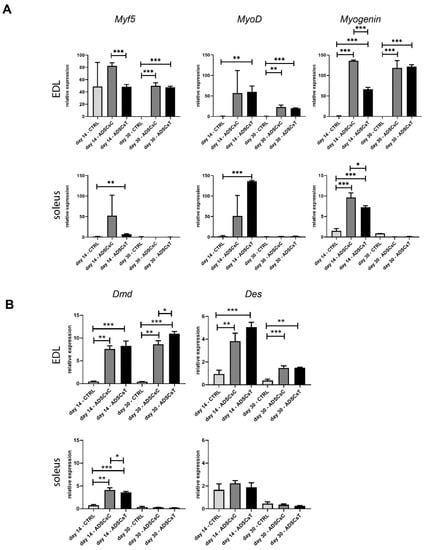 Expression of mRNA encoding myogenic factors in EDL and soleus rat muscles injected with control as well as IL-4 and SDF-1 treated rADSCs. (A) Analysis of the level of mRNAs encoding Myf5, MyoD, and Myogenin. Expression was related to the mean expression level observed in control muscle analyzed at day 7 and normalized to mRNA encoding HPRT; (B) analysis of the level of mRNAs encoding dystrophin (Dmd) and desmin (Des). Expression was related to the mean expression level observed in control muscle analyzed at day 7 and normalized to mRNA encoding HPRT. For each experimental group n = 3. Data are presented as mean ± SD. * represents results of Student’s t-test: * p ≤ 0.05; ** p ≤ 0.01, *** p ≤ 0.001. Skeletal muscles injured and injected with NaCl (CTRL), injured and transplanted with control rADSCs (ADSCsC) or IL-4 and SDF-1 treated rADSCs (ADSCsT).