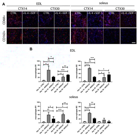Inflammation development of EDL and soleus rat muscles injected with control (ADSCsC) as well as IL-4 and SDF-1 treated rADSCs (ADSCsT). (A) Localization of M1 (CD68+) and M2 (CD163+) macrophages in regenerating muscles at days 14 and 30 of regeneration; bar: 50 µm. (B) Number in the field of view of M1 (CD68+) and M2 (CD163+) macrophages in regenerating muscles at 14 and 30 day of regeneration. For each experimental group n = 4. Data are presented as mean ± SD. * represents results of Student’s t-test: * p ≤ 0.05; ** p ≤ 0.01, *** p ≤ 0.001.