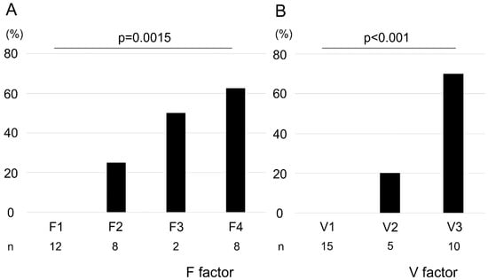 Association between pathological malignancy rate and F–V factors. Pathological malignancy rates increased with increasing F- and V-factor scores (A, F factor; B, V-factor). Statistical significance was determined using the Cochran–Armitage trend test.