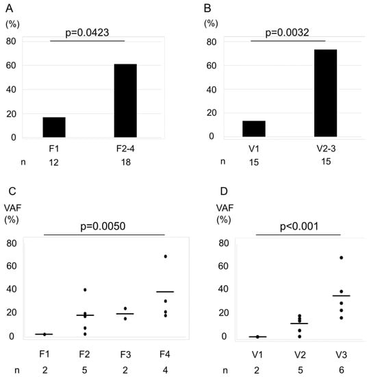 Association between the percentage of cases with a gene mutation and F–V-factor scores. Bar graphs represent the percentage of cases with a gene mutation by F factor score (A) and V-factor score (B). The rate of genetic mutations of F2–F4 was higher than F1 (A). The rate of genetic mutations of V2–V3 was higher than V1 (B). Statistical significance was assessed using χ2 test. The variant allele frequencies (VAFs) increased with increasing F- and V-factor scores (C, F factor; D, V-factor). Horizontal bars indicate the mean. Increasing trends were analyzed using the Jonckheere–Terpstra trend test. VAFs were plotted only for specimens with a confirmed gene mutation.