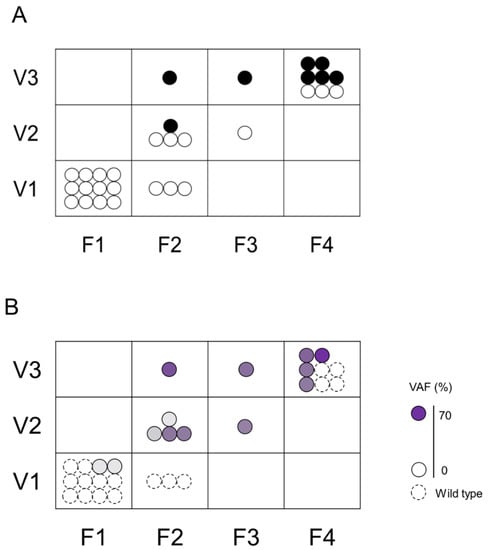 Association between the histological assessment and genetic mutations in F–V classification. The upper Figure (A) shows the association between F–V classification and histological assessment. Black circle (●) indicates malignancy and white circle (〇) indicates non-malignant lesions. The lower Figure (B) shows the association between F–V classification and genetic mutation. Dotted circles represent specimens without genetic mutation, and solid circles represent specimens with genetic mutation. The color density in the circle indicates the VAF.