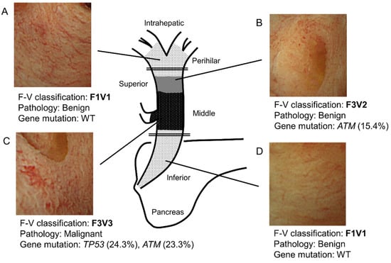 Multiple clinical implications were fostered by the findings of this study. First, the F–V classification of POCS findings may guide in the assessment of the potential risks in diagnosed bile duct tumors. In a prospective multicenter study, the diagnostic accuracy of BTC superficial spread has been reported to be 83.7% (41/49) for POCS findings and 92.9% (39/42) for POCS with biopsy []. However, even with the addition of biopsy to the POCS diagnosis, the accuracy remains to be imperfect, probably because biopsy specimens were too small for histological diagnosis and the gray zones of the histologic characteristics that exist precluded differentiation between benignity and malignancy. As shown in Figure 4, some samples with mutations but without histological confirmation of malignancy had V2 findings by the F–V classification. In other words, a V2 finding in the F–V classification may be equivalent to a histologic diagnosis of malignancy or to a potential risk of malignancy because only this finding can allow the identification of mutated bile duct epithelium without histological confirmation of malignancy. Furthermore, in another study, we recently reported similar concepts about the relation between the endoscopic findings of colorectal tumors and genetic abnormalities []. Accumulated gene alterations in the adenoma components of colorectal carcinoma could be diagnosed based on irregular surface pattern findings on magnifying endoscopy. this means that a gray zone with accumulated genetic changes exists that cannot be diagnosed as malignant tumor via histology. Second, in accordance with the preceding discussion, we believe that the F–V classification may be useful in determining whether the surgical margins for the papillary and nodular expanding types of BTC are distal or perihilar. The papillary and nodular expanding types of BTC tend to show extensive spread on histology [,,] and often require hepatectomy, in addition to pancreatoduodenectomy []. The F–V classification of POCS findings may be beneficial, especially for the gray zone that cannot be diagnosed even by biopsy.
