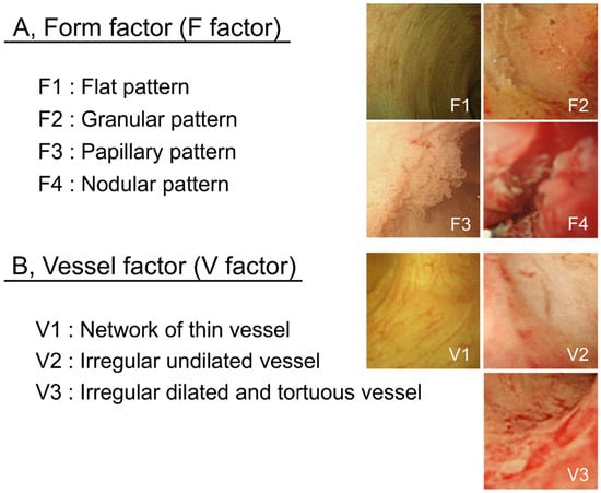F–V classification of bile duct POCS findings. Bile duct epithelium POCS findings were classified into 4 surface structure groups (F1–F4) (A) and 3 vessel pattern groups (V1–V3) (B).
