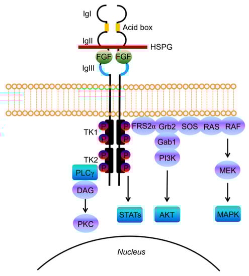Upon ligand binding the receptor undergoes dimerization, which leads to a conformational shift in receptor structure that subsequently induces a trans-autophosphorylation event of the intracellular kinase domain, driving the activation of downstream signal transduction pathways (Figure 1) []. The phosphorylated tyrosines are recognized and bound by adaptor proteins that contain Src homology 2 (SH2) domains or phospho-tyrosine binding (PTB) domains. FGFR substrate 2 (FRS2) is an adaptor protein largely specific to FGFR that, upon phosphorylation by activated FGFR, recruits other adaptor proteins (SOS, GRB2) that end up in activating RAS and the downstream RAF/MAPK pathway, mainly involved in mediating cellular proliferation [,]. Alternatively, GRB2 can also bind GAB1 and activate the PI3K/AKT axis, promoting cell survival. Lastly, direct phosphorylation by the activated FGFR tyrosine kinase stimulates other pathways, such as the signal transducers and activator of transcription (STAT) pathway, or phospholipase Cγ (PLCγ). The latter leads to the production of phosphatidylinositol-3,4,5-triphosphate (PIP3) and diacylglycerol (DAG), and activates the downstream protein kinase C (PKC) signaling [,,].
