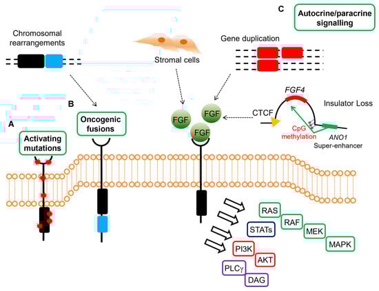Mechanisms of oncogenic FGFR signaling in gastrointestinal stromal tumors (GISTs). FGFR signaling contributes to oncogenesis through several ligand-dependent and -independent mechanisms in GISTs, signaling through RAS/MAPK, PI3K/AKT, signal transducers and activator of transcription (STATs), phospholipase Cγ (PLCγ). (A) Activating mutations resulting in increased kinase activity in absence of ligand are present in quadruple WT GISTs. (B) Chromosomal translocations drive the fusion of parts of FGFR1 to other genes, thereby resulting in receptor hyperactivation in a ligand-independent manner. These events were identified in quadruple WT GISTs. (C) FGFRs can be stimulated by their ligands either in a paracrine fashion, through FGFs produced by stromal cells, or in an autocrine manner, when FGFs are produced directly from the tumor cells that also express FGFRs. In quadruple WT GISTs, FGF4 is overexpressed through genomic duplication of the FGF4 locus, while SDH-deficient GISTs overexpress FGF3/FGF4 by an epigenetic mechanism linked to hyper-methylation of the FGF4 insulator that disrupts CTCF binding, thus allowing the ANO1 super-enhancer to activate the FGF genes. In KIT-mutant GISTs, a role for autocrine or paracrine FGFR signaling has been proposed driving imatinib resistance.
