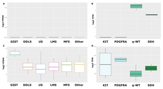 Gastrointestinal stromal tumors (GIST) are the most common mesenchymal tumors of the GI tract, arising from the interstitial cells of Cajal (ICCs) or their precursors. Since the identification of v-kit Hardy–Zuckerman 4 feline sarcoma viral oncogene homolog (KIT) or platelet-derived growth factor alpha (PDGFRA) activating mutations, GISTs have been considered one of the first examples of oncogene-addicted solid tumor, soon becoming the paradigm of precision oncology and leading to tyrosine-kinase inhibitors (TKIs) as the standard of care for this chemo-resistant rare tumor. Indeed, imatinib first, then sunitinib and regorafenib are recognized as the approved sequence of treatment for advanced GISTs and new TKIs, such as avapritinib and ripretinib, and are already in development [,,,,]. As widely known, GISTs are extremely heterogeneous in clinical presentation and behavior, as well as in the molecular background underlying this heterogeneity and in the response to TKIs’ treatment. Although the vast majority of GISTs harbors KIT mutations that confer the highest sensitivity to TKIs, or more rarely PDGFRA mutations, about 10–15% of adult cases do not harbor any of these driver mutations and have historically been called as wild-type (WT). Among them, from 20% to 40% show loss of function of the succinate dehydrogenase complex (SDH), therefore defined as SDH-deficient GISTs [,,]. This subgroup is readily identifiable on the basis of clinical features [,], of the global genomic hypermethylation driven by SDH loss [], and of the specific gene expression profile, characterized by IGF1R overexpression and by the peculiar commitment to the neural lineage cell fate [,,]. Conversely, about 15% of KIT/PDGFRA WT cases harbor mutations in BRAF/RAS or NF1 and are referred to as RAS-pathway (RAS-P) mutant GISTs [,,,]. The remaining cases, accounting for about 5% of all GISTs, are usually referred to as KIT/PDGFRA/SDH/RAS-P WT or quadruple WT (qWT) GISTs []. Notably, this specific subgroup shares a distinct transcriptome profile that is profoundly different from other GIST subtypes []. In particular, the qWT GISTs share the overexpression of NTRK2 and ETS-transcription factor family (ERG), that may play a potential role in their pathogenesis []. However, to date a consensus on the recurrent oncogenic driver has still not been found, whereas many different and often private mutational events have been reported, confirming the great molecular heterogeneity of this subgroup of GISTs [].