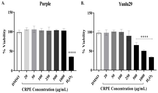 Cytotoxicity of coloured rice phenolic extracts (CRPE) on INS-1E cells. The cells were exposed to coloured rice extracts (purple [A] and Yunlu29 [B]) at various concentrations for 6 h, followed by resazurin red assay (n = 5). Asterisks indicate significant differences to the control group (DMSO), where, ****p < 0.0001; one-way ANOVA with turkey’s multiple comparison post hoc test. Data is presented as mean ± SEM. DMSO–-dimethyl sulfoxide; H2O2 –-Hydrogen peroxide.